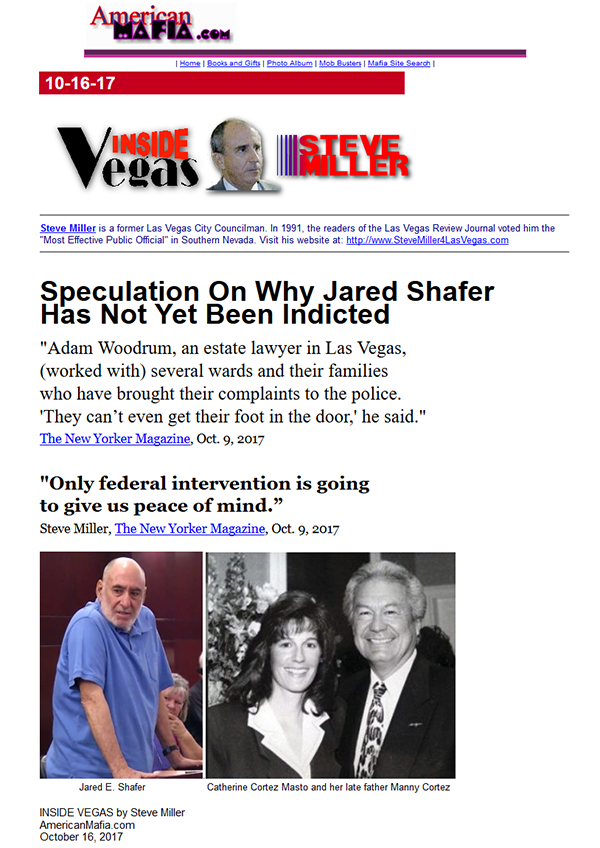 “I will no longer refer guardianship victims of Jared E. Shafer, or PFSN, Inc., to the LVMPD Abuse and Neglect Detail. I will suspend my referrals until officers within that detail issue “Requests for Prosecution” of Mr. Shafer and his associates to the Clark Co. District Attorney or Nevada Attorney General. At this point in time, I fully believe that certain officers in this detail are working for Shafer, and passing him confidential information from those he exploited. Otherwise, with the exception of the Abuse and Neglect Detail, I have full confidence in the Las Vegas Metropolitan Police Department and its fine, brave officers.” – Steve Miller
